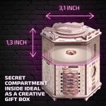 Interesting giftI remember playing with puzzle boxes when I was a child and even when I was older. This box is a little different as it has all kinds of knobs and levers sticking out of it and clues to solve. It is quite challenging. It has a small inside compartment that could hold a tiny gift for the recipient who figures out the puzzle.